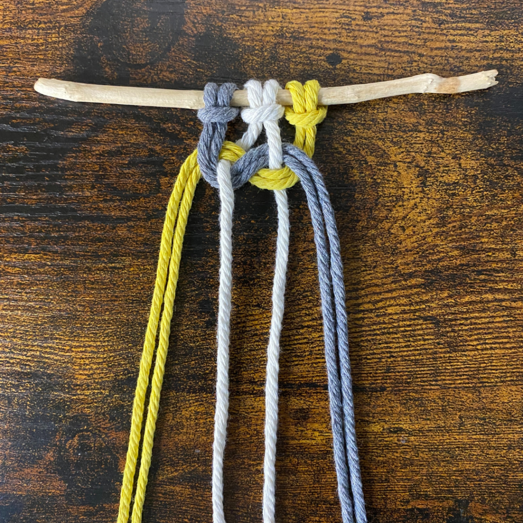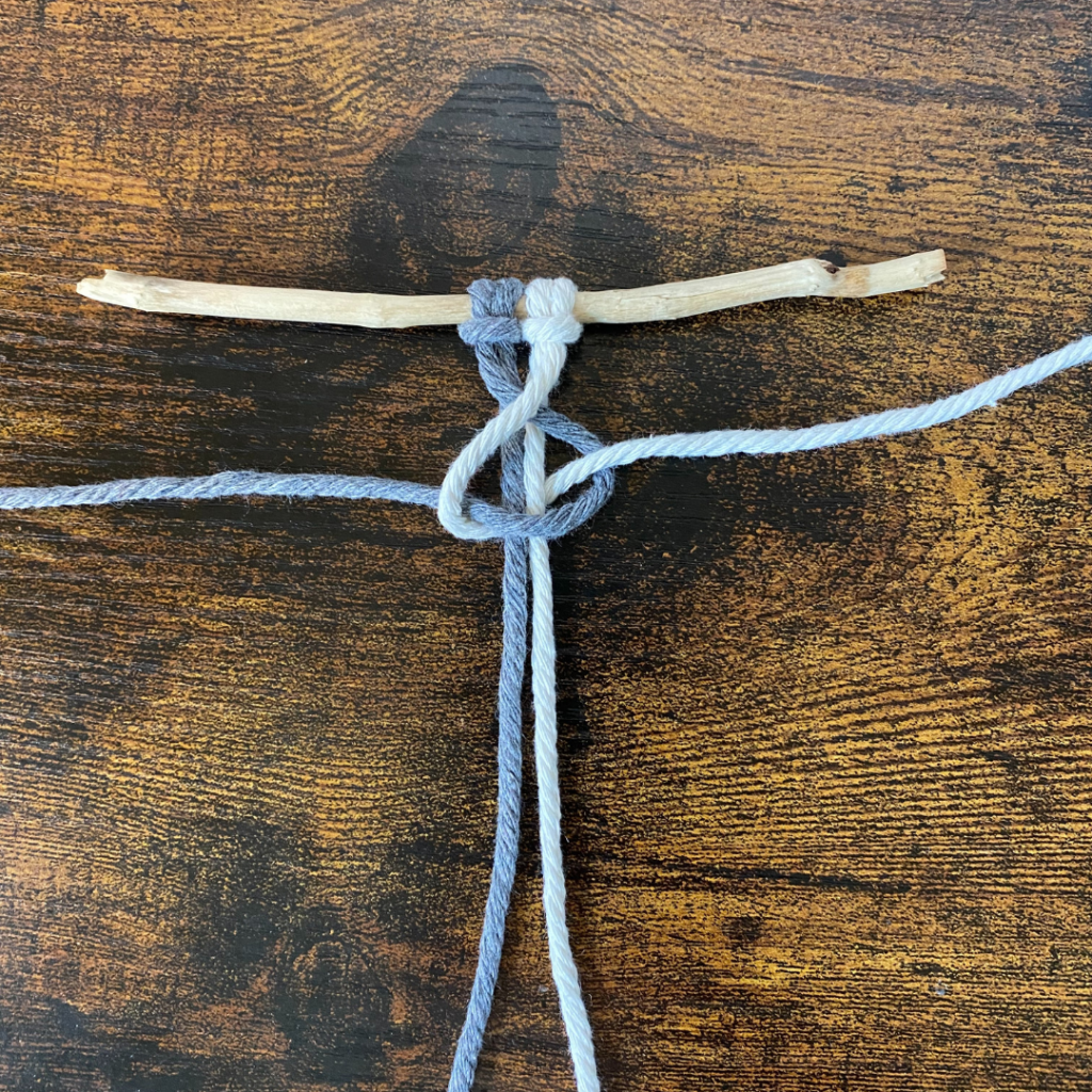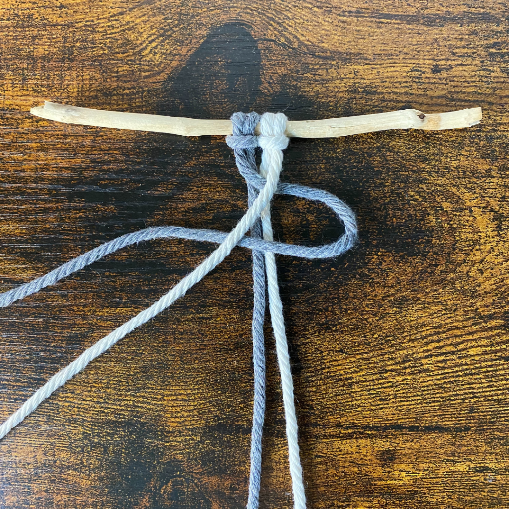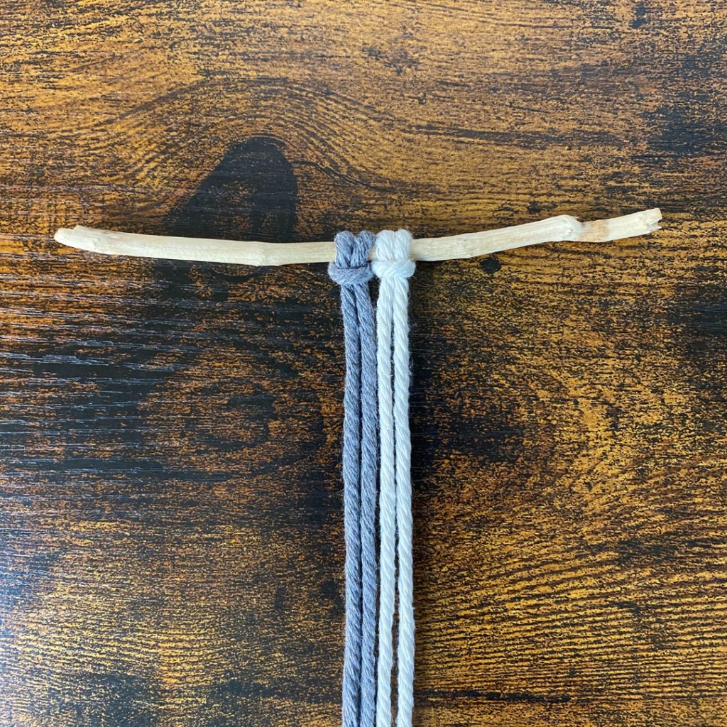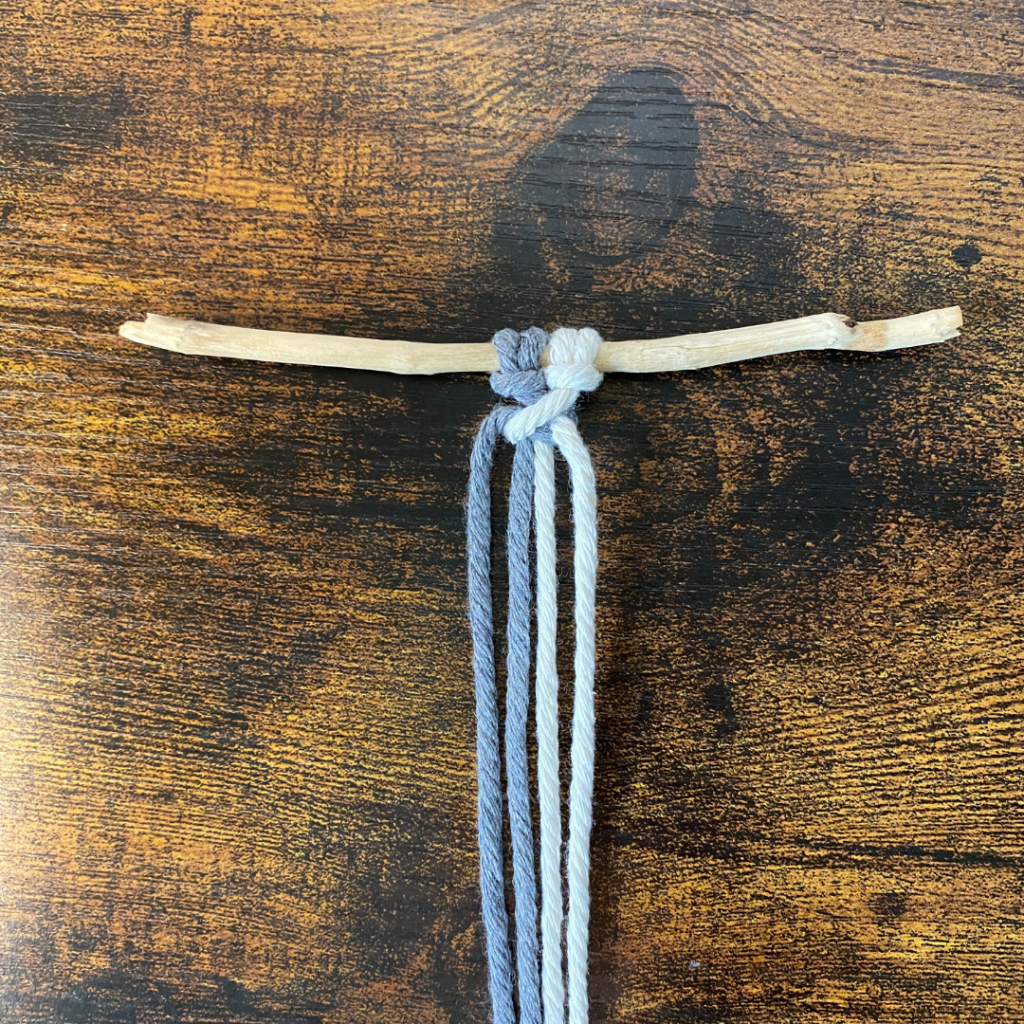 Für diesen Knoten benötigst du zwei Garne, welche du doppelt legst und somit 4 Fäden entstehen. Du kannst beide in der selben Farbe wählen, oder in zwei unterschiedlichen Farben.