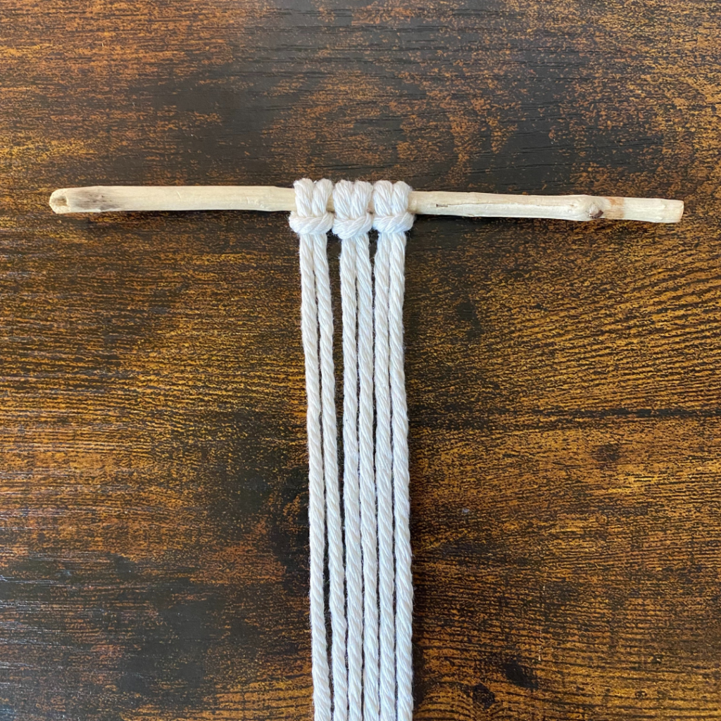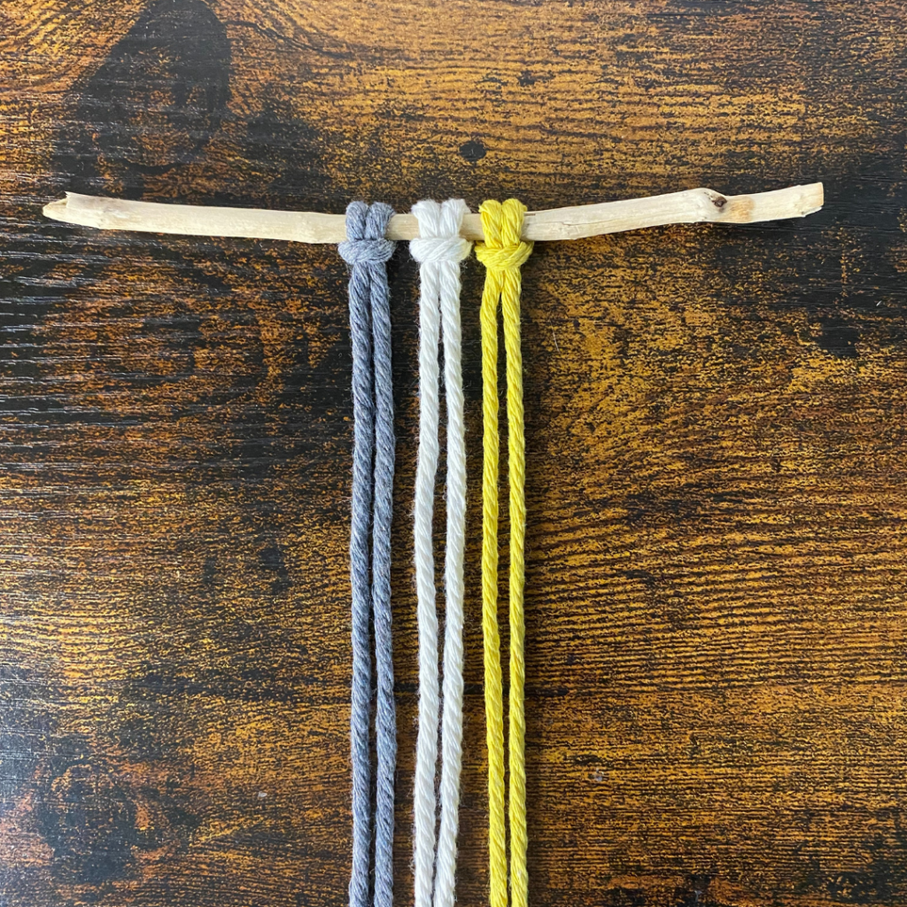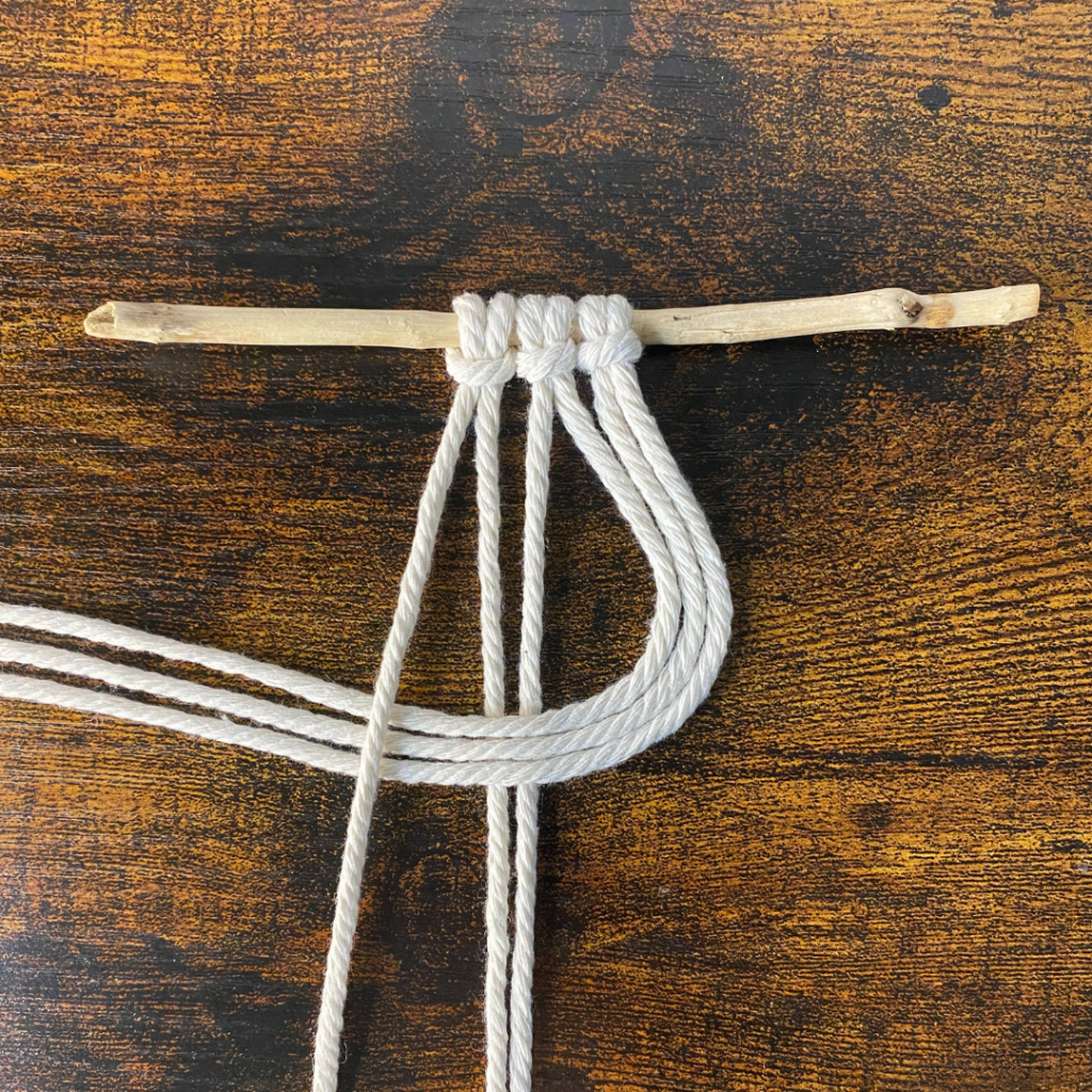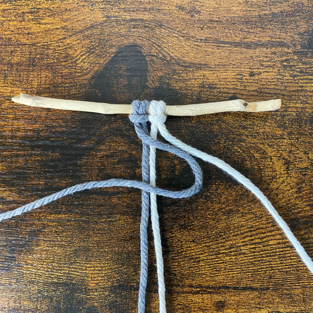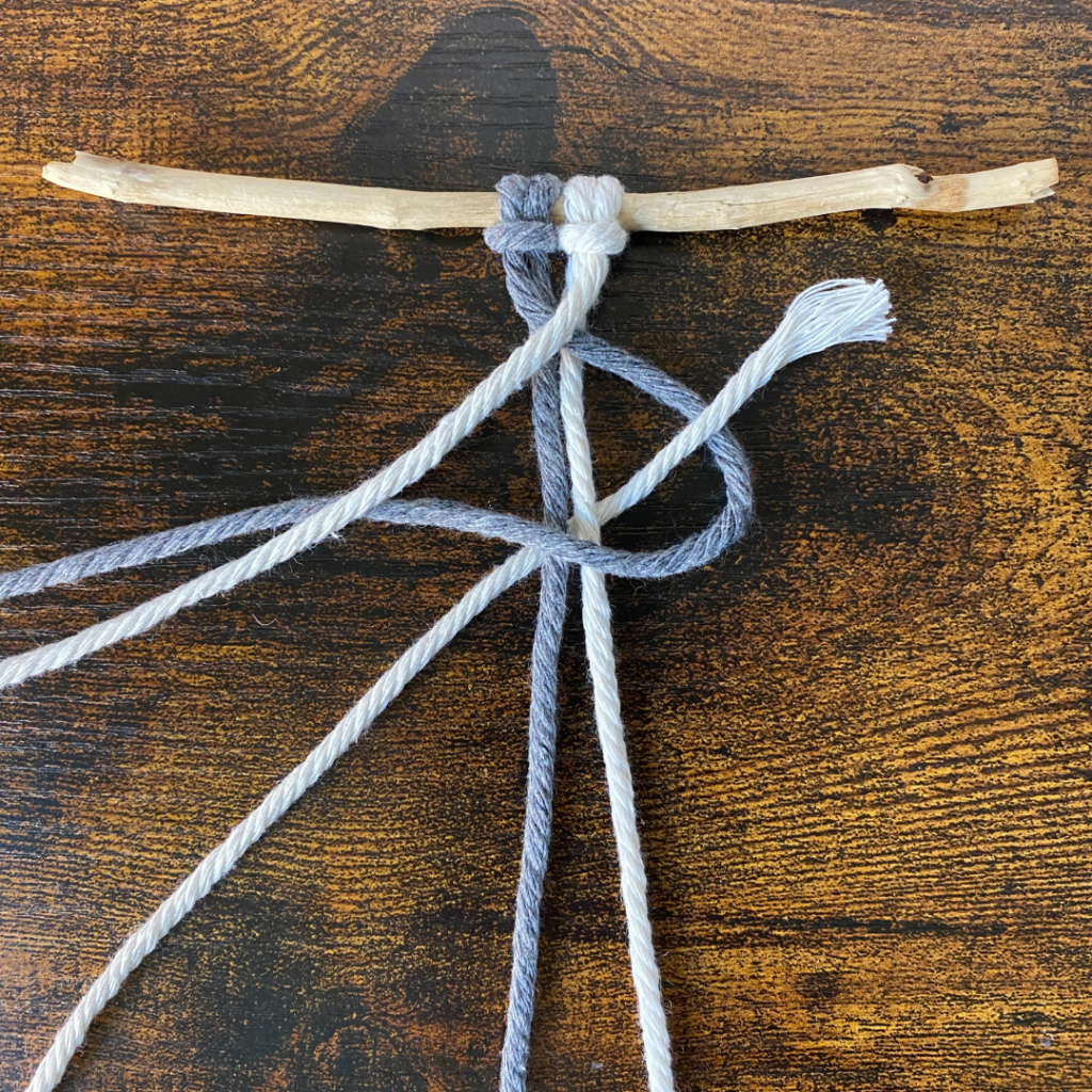 Für diesen Knoten benötigst du zwei Garne, welche du doppelt legst und somit 4 Fäden entstehen. Du kannst beide in der selben Farbe wählen, oder in zwei unterschiedlichen Farben.