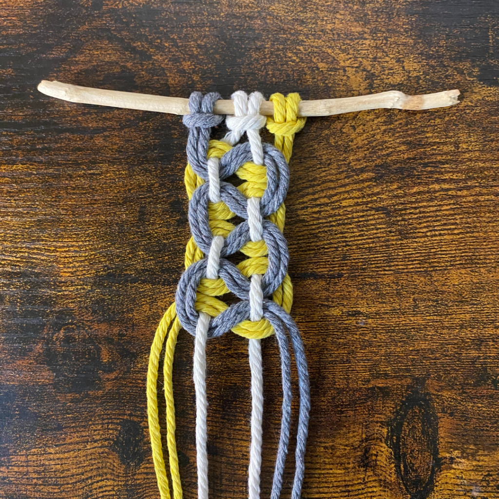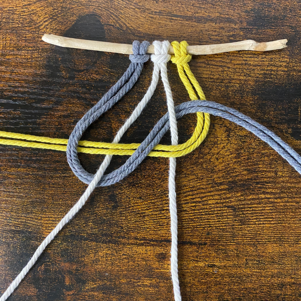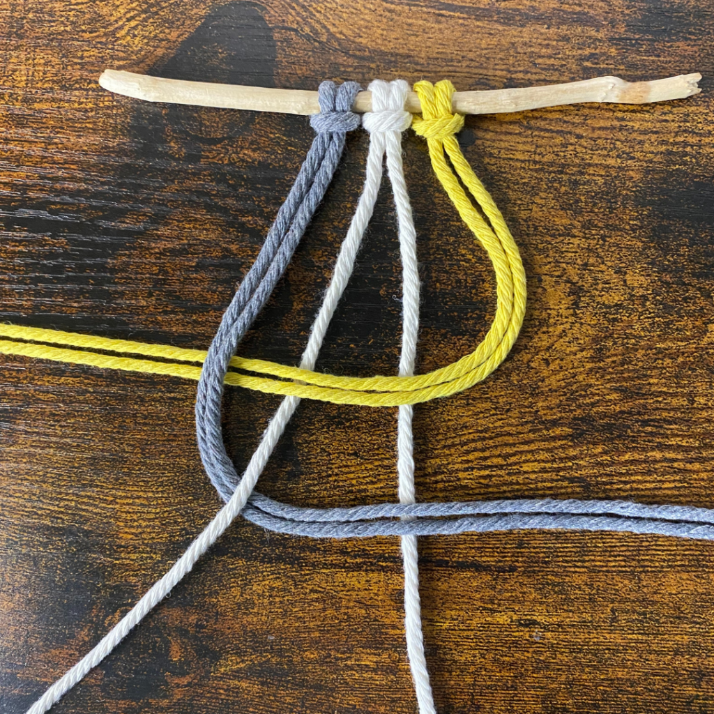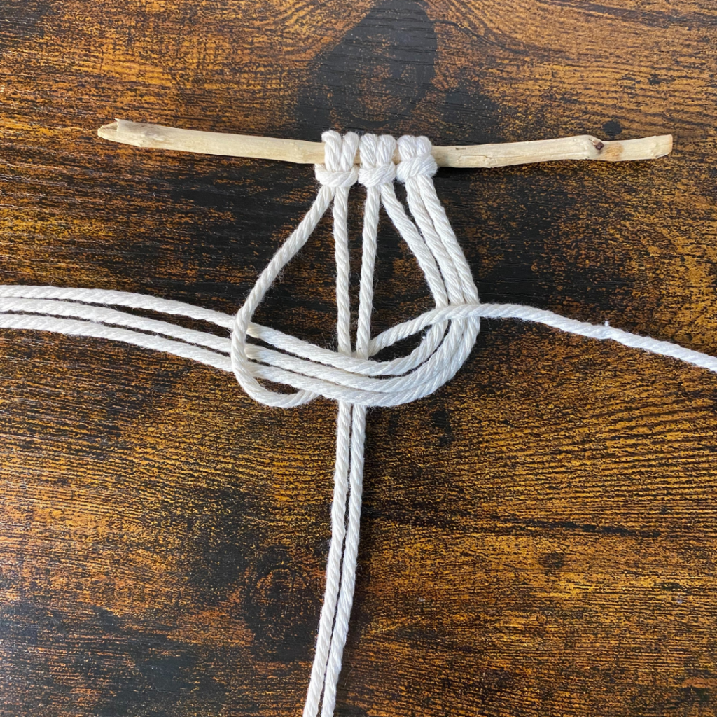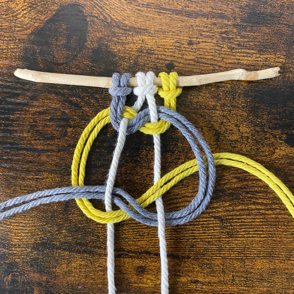Lege anschließend den rechten der beiden Füllfäden über deinen rechten arbeitsfaden. Führe dann die Enden der rechten Arbeitsfäden über den linken Arbeitsfaden und unter dem linken Füllfaden hindurch. Und ziehe alles fest