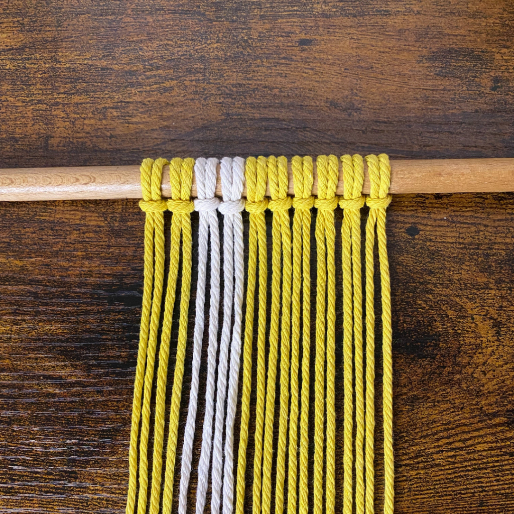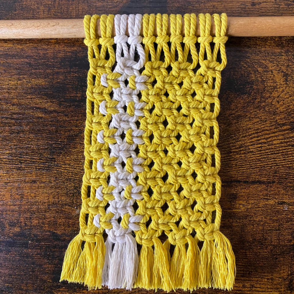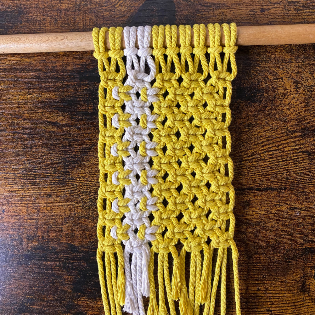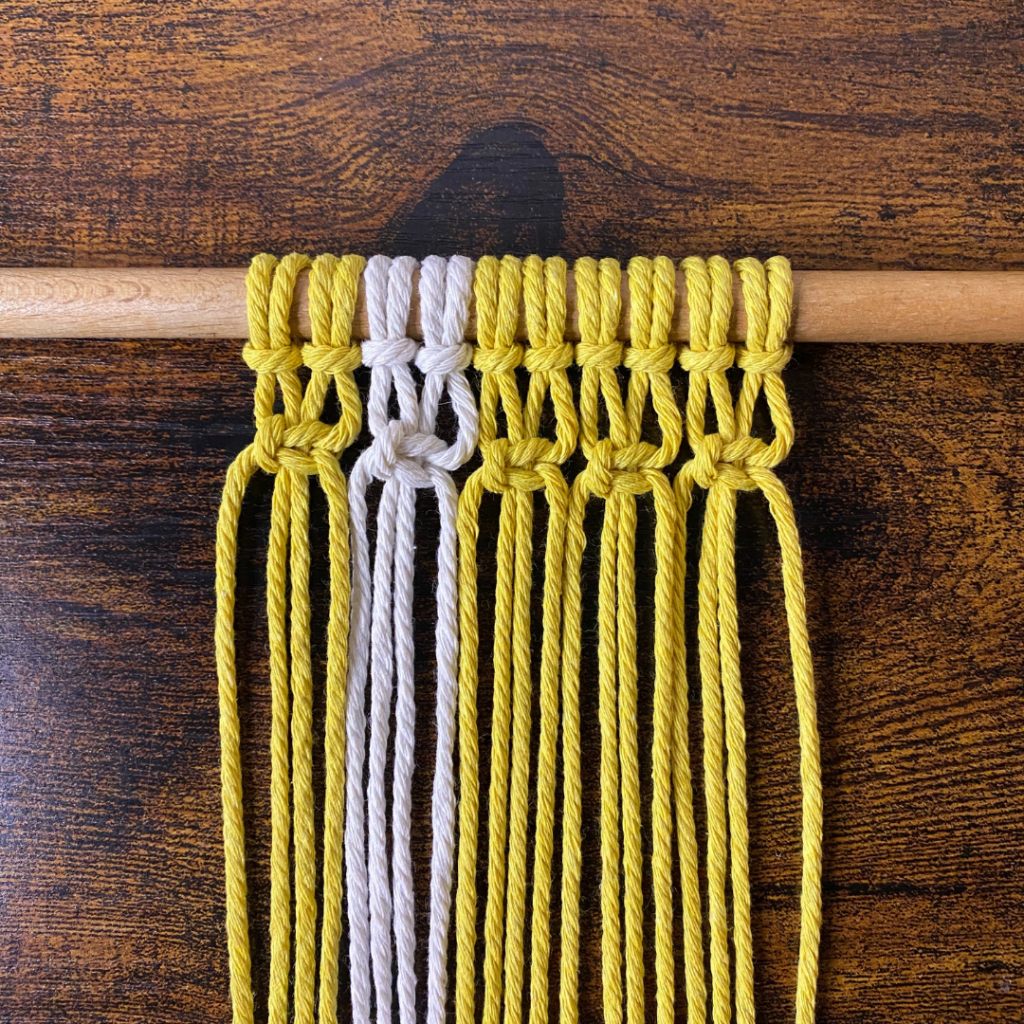 In der zweiten Reihe knotest du nun 4 versetzte Kreuzknoten. Dafür lässt du die ersten beiden und die letzten beiden Fäden aus.